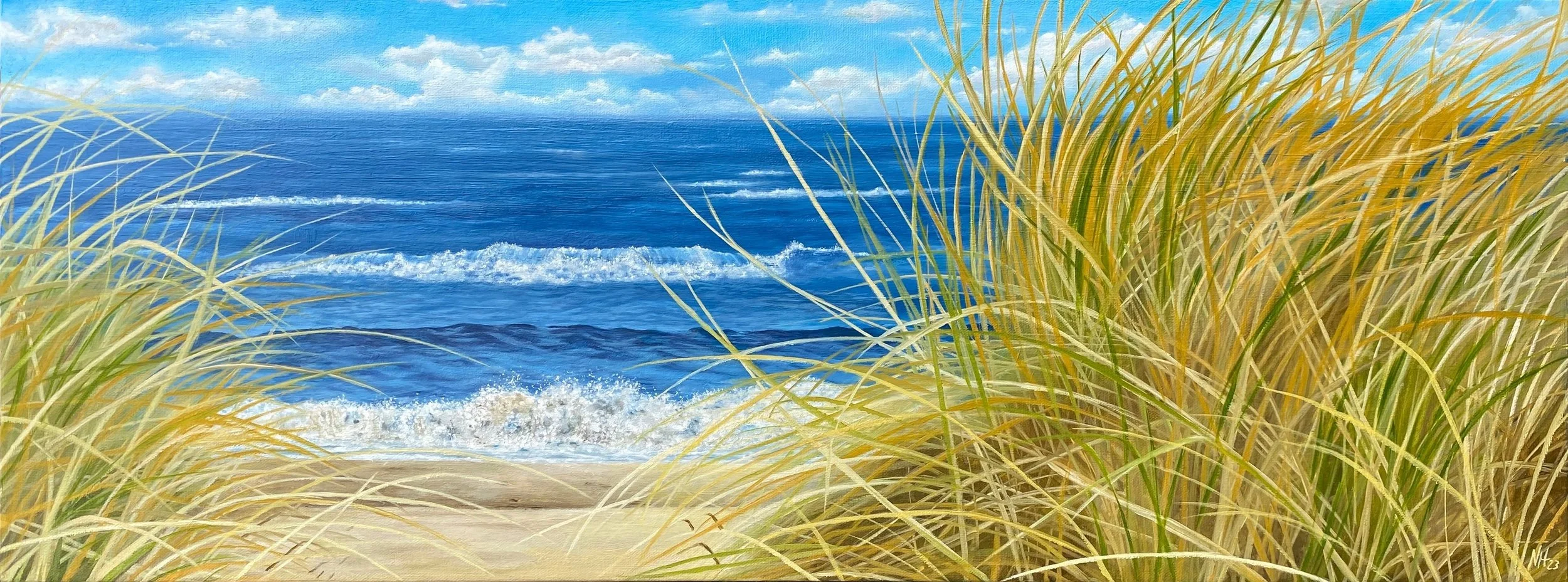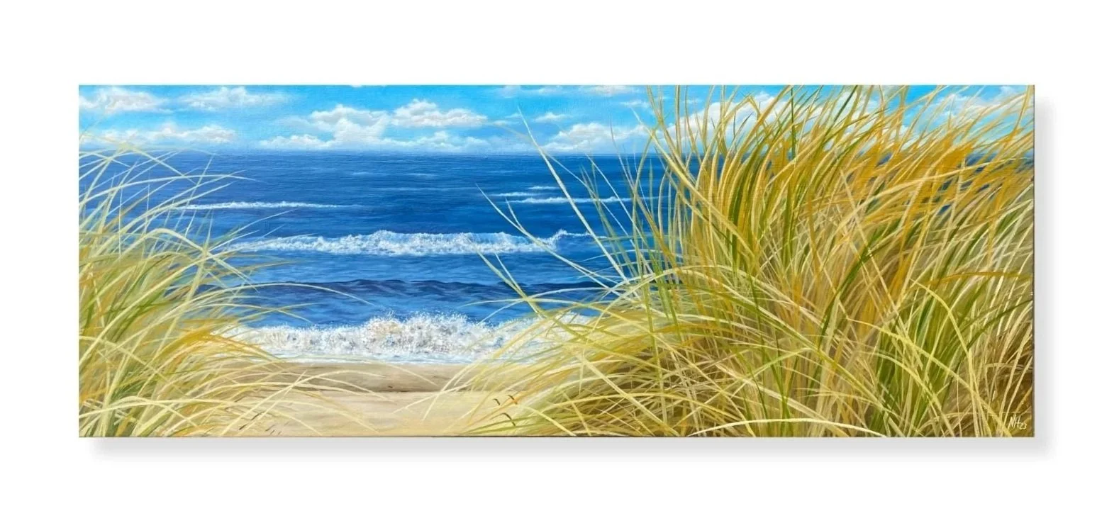 Lass dich von der stillen Bewegung dieses Kunstwerks einfangen und mitnehmen. Wolken ziehen vorüber, Wellen rollen heran, brechen sanft und wirbeln den Sand Richtung Strand auf. Im Vordergrund entfaltet der Strandhafer seine feine Präsenz: zarte Halme und kleine Stoppeln, die aus dem Boden sprießen, getragen von Nuancen aus Ocker, Beige, Creme sowie lebendigem Grün bis ins dunkle Braun. Entdecke, wie die Wellen im Hintergrund ruhig beginnen, zum Ufer hin an Kraft gewinnen und dabei den Sand mit sich führen. Ein Zusammenspiel aus Weite, Detailreichtum und natürlichem Rhythmus – das den Blick verweilen lässt und immer wieder Neues offenbart.