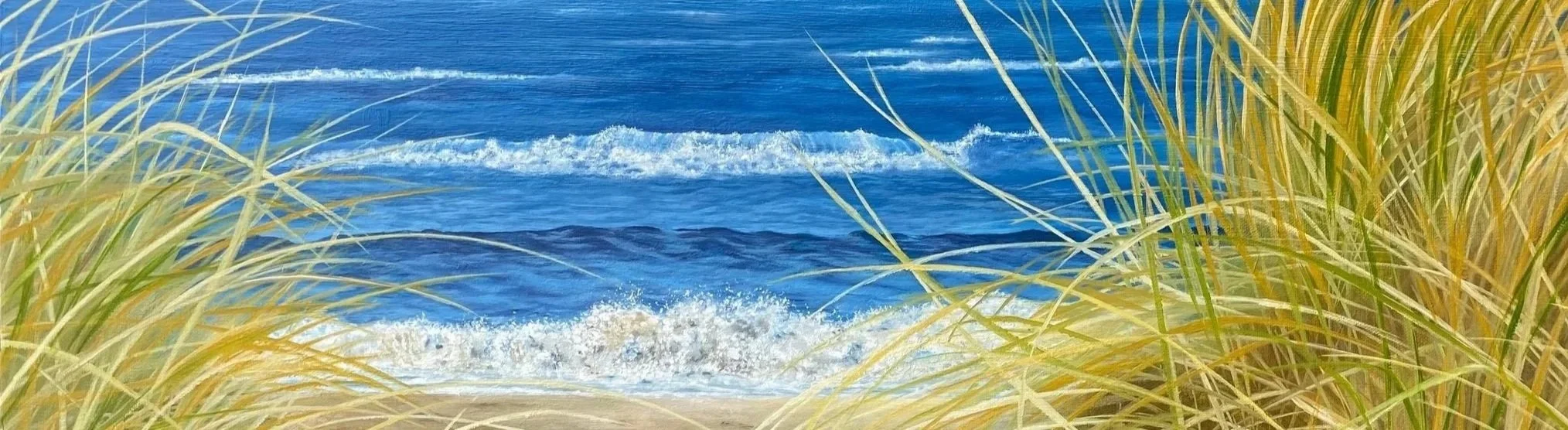 Sanfte Wellen rollen aus der Ferne heran, gewinnen zum Ufer hin an behutsam Kraft und wirbeln den Sand behutsam auf. Der Strandhafer im Vordergrund wächst aus dem Boden, fein und lebendig, in Nuancen von Ocker, Beige, Creme und tiefem Grün. Der Wind scheint sanft durch die Halme zu ziehen, während das Meer Weite und Tiefe zugleich vermittelt - beruhigend, ordnend und einen Raum öffnet, in dem Gedanken zur Ruhe kommen dürfen.