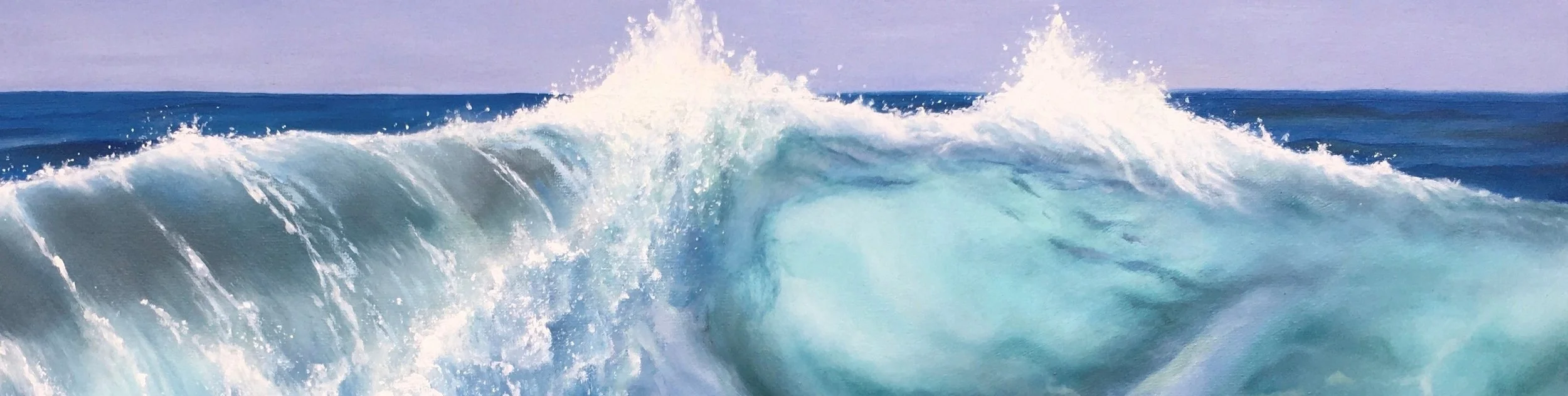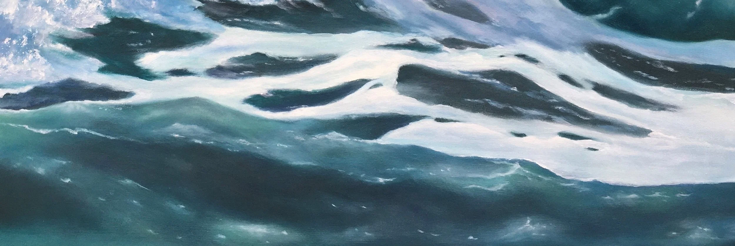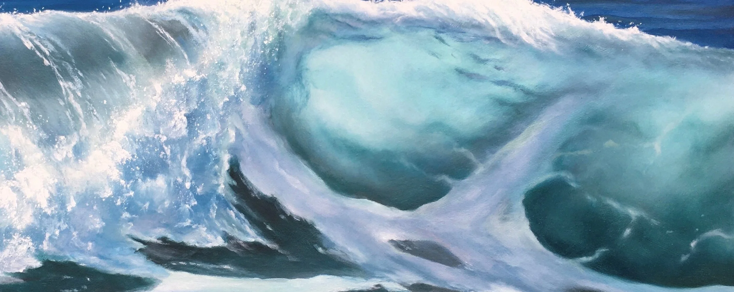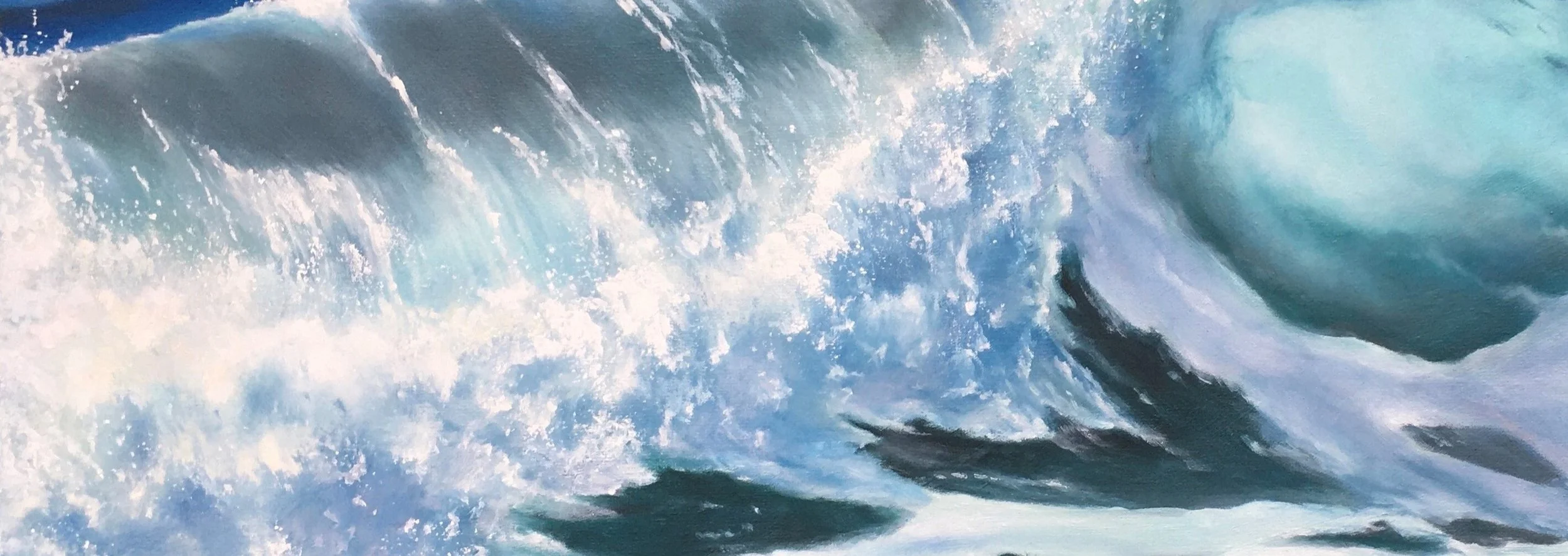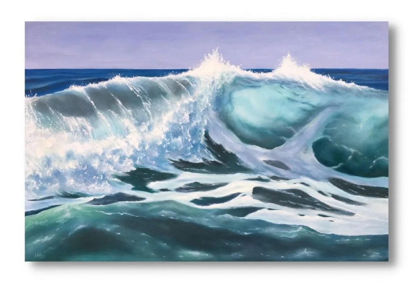 Die Welle richtet sich kraftvoll auf und öffnet den Raum nach oben, als würde sie sich bewusst dem Himmel zuwenden. Von links nach rechts entfaltet sich ihre Bewegung: Schäumend, aufbrechend, bis sie in ruhiger Präsenz an Klarheit gewinnt. Leuchtende Blau- und Türkistöne, durchscheinende Flächen und feine Lichtreflexe füllen den Raum mit Energie und erinnern an inneres Wachstum.
